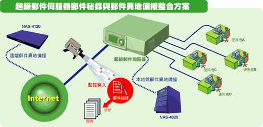 Logger)功能,所有郵件寄送都有一份備份存檔,幫助中小企業老闆了解員工E-mail內容,適時防止公司機密外洩,也可以從員工郵件記錄中,了解員工平日工作情況,以做為員工評核的參考。